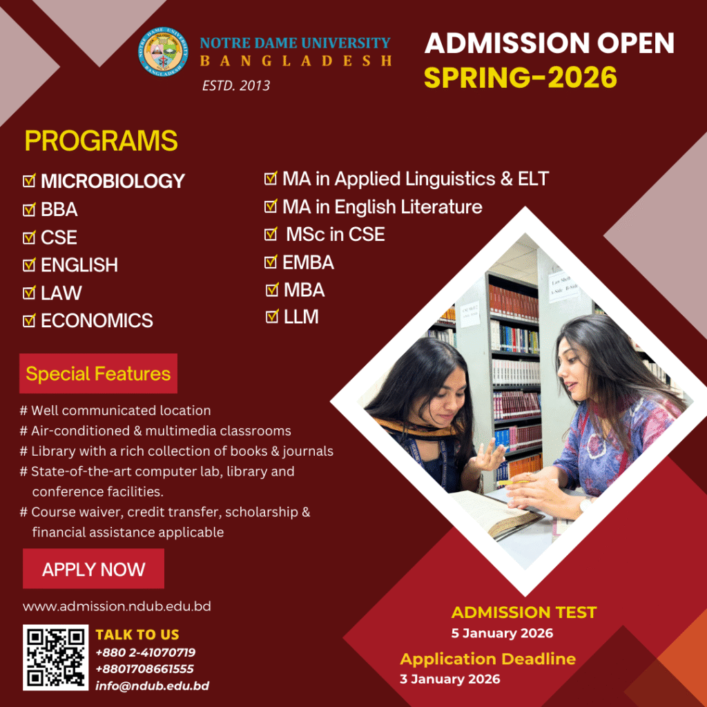 Notre Dame University Bangladesh is now open for online admission. Students can pursue their Master’s studies in M.B.A., EMBA, English Literature, E.L.T. & Applied Linguistics, and LL.M. Honor’s programs of NDUB includes B.B.A., C.S.E., English, and LL.B. The university provided a 10% waiver for both male and female students during the Covid-19 crisis. Also, a further 10% waiver is being offered for students who have passed H.S.C. from Missionary Colleges.